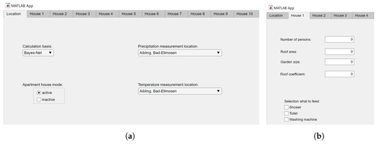 After starting the program, the input window opens, where the user can select the location (Figure 7a). The possible locations result from the location list of the measuring stations of the German Weather Service (DWD). The script downloads the corresponding local precipitation and temperature data and prepares them in the targeted resolution. In addition, the approach for the consumption calculation is requested in this tab where the designer selects between the BN and the simplified virtual tree diagram. Furthermore, the designer chooses whether the multifamily house mode (MFHM) should be activated. If so, the frame of reference changes from a neighborhood with ten properties to a multifamily house with ten flats so that the demand of the residents can be calculated accordingly. In the MFHM, only the roof area of house one is considered, and the interconnection of several tanks is deactivated. Figure 7b shows the input window for the respective houses/apartments, where the number of inhabitants, roof area, roof coefficient, size of the garden, and the single consumers of rainwater are requested. The last option allows the developer to compare different scenarios, e.g., when no car cleaning is allowed, and thus investigate the sensitivity of such measures on the system’s behavior.