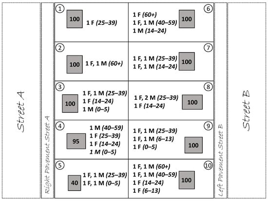 The system was tested on a neighborhood consisting of 10 one-family houses located in Hanover, Germany. Figure 8 shows the composition, numbering, and in the grey fields the individual yield areas in square meters. Moreover, the indicated population was generated by the consumer model following the BN approach, broken down by gender and age.