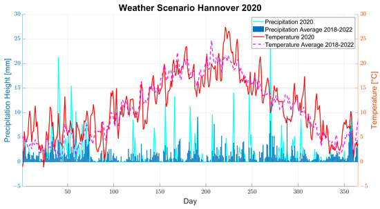 According to EN 16941-1, the weather data for the last five years were taken as input from the German Weather Service. Figure 9 shows the mean precipitation and temperature data for these five years, as well as the daily precipitation and temperature for 2020, which are the median of the data set (Table 2). Because the extreme precipitation events are cut off in the mean, but these data are relevant to the resource balancing considered later, the 2020 data were used for the following simulations.