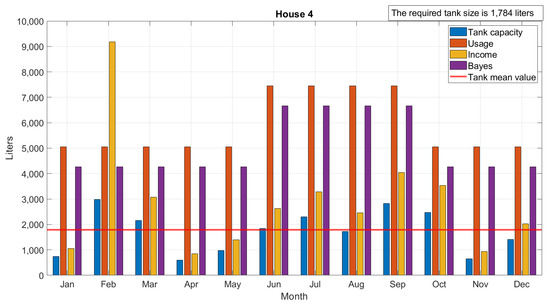 To evaluate the influence of the demand calculation approach, the neighborhood referred to in Figure 8 was populated once using the BN approach and once by using the virtual tree diagram. Figure 10 shows the monthly evaluation for a household with four people, indicating the capacity of the tank, the amount of rainwater and cleaning water collected as income, and the calculated demand. This constellation is consumption-dominant, so that a self-sufficient supply of rainwater is not always given.