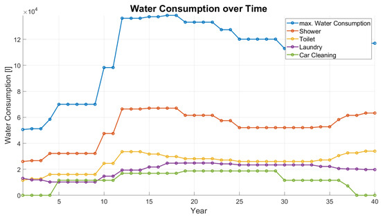 Figure 11 shows the water consumption for shower, toilet, laundry, and car washing in this projection. It can be seen that peak water demand is more than twice that of the initial setup.