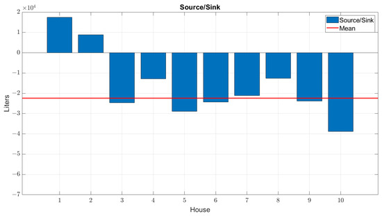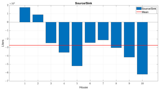 To assess the resource balancing, Figure 12 shows the balance sheet for the entire neighborhood. In particular, it can be seen that Houses 1 and 2 generate a surplus throughout the year, which is due to the small number of inhabitants, whereas Houses 5 and 10 consume significantly more than they generate, either due to a small yield area or due to a high number of inhabitants.