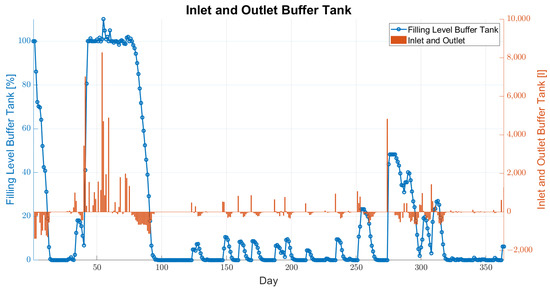 Up to this point, the program has viewed each RWH system as an isolated individual. For the networked view of the water grid, the program follows the model shown in Figure 5 with the central buffer tank. For resource balancing, a daily resolution is used to better analyze when and how much water can be exchanged and how many days can be covered with the buffer tank. A balanced matrix is created in which all relevant data are stored. The consumptions are divided into A, B, and C categories. The classification is based on the priority with which the individual consumptions are to be covered. A consumptions are toilet, shower, and laundry and should be covered with high priority. B consumptions are for garden irrigation and are fed when there is still water left after feeding the A consumptions. C-category water is used for car washing. It has the lowest demand priority and is fed only when A and B consumptions are covered. In the case of water rationing, B and C consumers can be blocked.