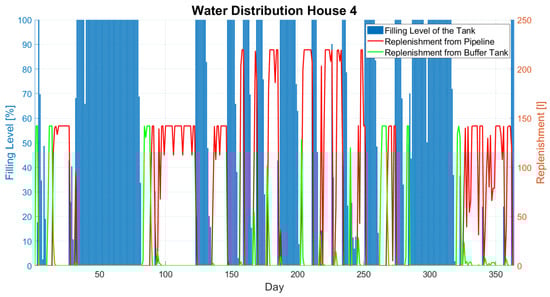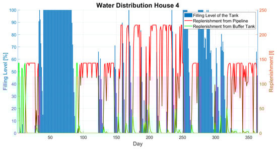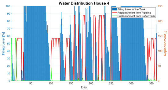 The neighborhood shown in Figure 8 is considered for this simulation with a networked water grid. To enable the exchange of surplus water, a central buffer tank with a capacity of 10,000 l was included in the simulation. At the beginning of the simulation period, the buffer tank is completely filled. The self-sufficiency period was selected as 21 days in accordance with the above standard. The area of the garden to be irrigated was assumed to be 30 m2 for all one-family houses. Irrigation is activated when a temperature of 15° is reached for five days. Table 4 shows the simulation data of the one-family-house neighborhood and the calculated replenishments from buffer and mains water supply, as well as the calculated tank size for each property.