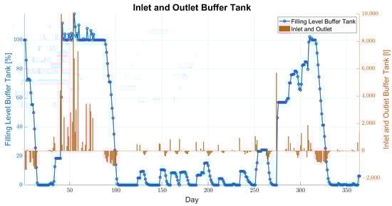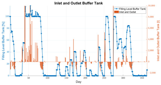 Afterwards, the yield is calculated using the building specifications, the precipitation data, and first-flush diversion. The system also instantiates the household’s internal water cycle. Depending on the number of people, it is therefore estimated that between 12 and 30 L of cleaning water is produced per week and returned to the storage tank. Based on statistics for the monthly number of home-cooked meals, a weighted random generator maps cooking behavior week by week for each household.