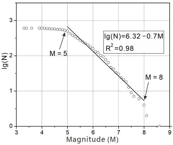 We used ArcGIS 10.5 to edit the attributes of 608 seismic events, and established the earthquake hazard database for the Chinese mainland from 1949 to 2021. The attributes of the earthquakes in the database include date of occurrence, epicenter latitude and longitude, magnitude, intensity, focal depth, number of casualties, and economic loss. We fit the cumulative magnitude–frequency distribution [35] of 608 earthquakes using the Origin 2018 software, as shown in Figure 2. Using the classification criteria for earthquake events specified in the National Earthquake Emergency Plan, the cumulative magnitude–frequency distribution of earthquakes with general earthquake hazards and above (M ≥ 5) obeys an exponential distribution. Using statistical methods, we also quantified the characteristics of the spatiotemporal distribution [36] of earthquake events and the associated losses.