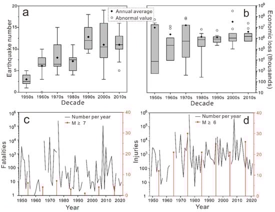 Chronological pattern of earthquake events and statistics of the losses caused: (a) number of earthquakes in a decade; (b) economic loss in a decade; (c) number of fatalities per year (black) and number of the M ≥ 7 earthquakes in a decade (red); (d) number of the injured per year (black) and number of the M ≥ 6 earthquakes in a decade (red).