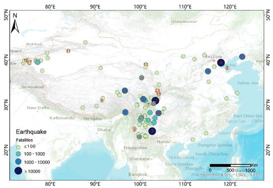 The data used in this study come from two sources: (1) the China Earthquake Networks Center (https://www.ceic.ac.cn, accessed on 12 July 2022) that provided information on earthquake magnitude, date of occurrence, macroscopic epicenter, and depth; (2) provincial (autonomous regions and municipality) earthquake agencies that provided the assessment reports of earthquake-hazard-related losses, including both the casualties and economic loss. We also filled in some missing information in other ways [34].