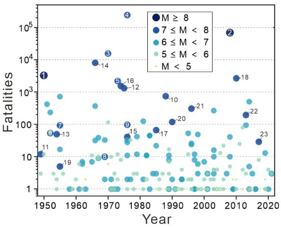 When analyzing the chronological pattern of earthquake events and the associated losses, we merged 1949 into the 1950s and similarly merged 2021 into the previous 10-year time period. In our analysis of economic loss, we converted the annual economic loss based on China’s GDP (Gross Domestic Product) data released by the National Bureau of Statistics of China (www.stats.gov.cn, accessed on 15 August 2022), using the economic loss in 2021 as a reference. From the 1950s to the last decade, the number of earthquakes showed a roughly increased trend (Figure 3a). The number of earthquakes has increased from an annual average of three to twelve (in the past 10 years), reaching the peak in the 1990s at an annual average of 12.8. The interdecadal average economic loss showed a jumping trend (Figure 3b), with the 2000s having an average annual economic loss of 33,510.4 million USD, followed by the 1970s with 15,478 million USD. The 1980s and 1990s had the fewest economic losses. The number of casualties is mainly controlled by major catastrophic earthquake events, and there is no obvious trend of an increase or decrease during the study period. For example, the two peaks in Figure 3c,d appeared in the 1970s and early 21st century, corresponding to the Tangshan earthquake in 1976 and the Wenchuan earthquake in 2008. A total of 82 earthquakes occurred in the decade 1970–1980, killing more than 260,000 people and injuring 767,000. The M7.8 earthquake that occurred in the densely populated Tangshan area in 1976 alone killed 242,000 people. In addition, with 110 earthquakes in the decade 2000–2010, the number is significantly higher. However, only about 70,000 people were killed and 390,000 were injured. In the 1980s and 1990s, casualties from earthquake events were minor. Although the economic loss caused by the earthquakes have reached an annual average of 4.21 billion USD in the past decade, the number of casualties has been effectively controlled. Details of the 23 typical earthquakes (M ≥ 7) that caused fatalities are listed in Table 1. Their geographical locations are shown in Figure 4. There is a clear concentration of developmental features in earthquake events with an M ≥ 6. Southwest China is a tectonically active earthquake-prone zone. When analyzing the chronological pattern of the number of deaths caused by the earthquakes, we considered the influence of magnitude. As shown in Figure 5, the magnitudes of the earthquakes that caused more than 1000 deaths were all above M6. The most devastating damage was caused by the 1976 Tangshan M7.8 earthquake, which killed 242,000 people and was the only earthquake to kill more than 100,000 people. There are also some unusual earthquakes in Figure 5, such as the 1969 Bohai M7.4 earthquake with a depth of 35 km. This earthquake was located in the Bohai Bay and killed only 10 people. In contrast, the Xiji M5.1 earthquake that occurred on the night of 3 December 1970, with a focal depth of 15 km, resulted in 117 fatalities because the local residents lived in earth kilns with extremely poor seismic resistance. The 1949 Kuche M7.3 earthquake and the 1955 Wuqia M7.0 earthquake both occurred within Xinjiang, which is among the least densely populated areas of the Chinese mainland. The fatalities caused by the two earthquakes were twelve and five, respectively, with a very low number of casualties. It can be seen that these unusual earthquakes are often related to the depth of the epicenter and the distribution of population.