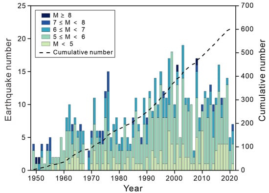A total of 608 earthquake events causing losses occurred from 1949 to 2021, and Figure 6 illustrates the number of earthquake hazards for each year. There is a general upward trend in the number of earthquakes, with a significant decrease in the past two years. The average annual number of earthquakes from 1949 to 1960 is three. The number changes to seven and twelve for 1961–1990 and 1991–2019, respectively. However, there is no obvious stable trend in the annual number of earthquakes; for example, no earthquake event causing casualties occurred in 1968. There was a high incidence of earthquakes around 2000, in which 19 earthquake hazards occurred in 2003. After 2000, the number of earthquake events fluctuated around ten, with less than five in 2002 and 2007.