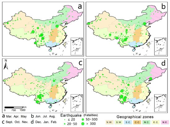 Seasonal distribution of earthquakes. Geographical zones: N.W.—Northwest, S.W.—Southwest, S.C.—South China, C.C.—Central China, N.C.—North China, E.C.—East China, N.E.—northeast. The subfigure in the lower right corner represents South China Sea.