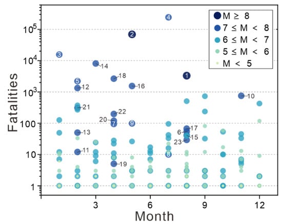 The 608 earthquakes were classified according to the number of deaths: ordinary earthquakes (causing less than 20 deaths), moderate earthquake hazards (causing 20–50 deaths), major earthquake hazards (causing 50–300 deaths), particularly major earthquake hazards (causing more than 300 deaths). Table 2 lists the seasonal distribution of each class of earthquake hazards, with six particularly major earthquakes occurring in winters and only two in autumns. Except for particularly major earthquakes, there is not much difference among the four seasons. As can be seen from Figure 7, no matter in which season the moderate or major earthquake hazards occur, Southwest China is always a high-incidence area. Detailed information of earthquake proportion in the Southwest is listed in Table 2. Table 3 lists the earthquake hazards and casualties for the four seasons, with the number of earthquakes occurring slightly higher in the summer than in the other three seasons. The Tangshan M7.8 earthquake on 28 July 1976 killed 242,000 people and injured more than 700,000; the Wenchuan M8 earthquake on 12 May 2008 killed 69,000 people and injured 375,000. These two earthquakes caused the highest number of casualties, which explains why the casualties in the spring and summer are the most serious. As mentioned above, the number of casualties is mainly influenced by major events. Figure 8 shows the number of fatalities caused by earthquakes with different magnitudes in each month. The nine earthquake events that led to more than 1000 fatalities are all distributed between January and August. Earthquake events with less than 100 fatalities are more evenly distributed in the four seasons.