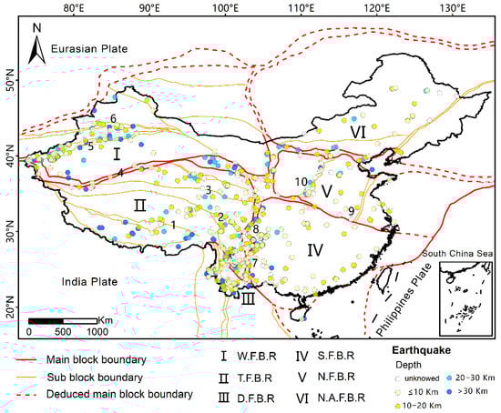 Spatial distribution of earthquake depths. The block information is referenced to Zhang et al. [37]. W.F.B.R.—Westfield fault block region (F.B.R.—fault block region), T.—Tibetan, D.—Dian–Mian, S.—South China, N.—North China, N.A.—Northeast Asia. Faults: 1—Lijia, 2—Yushu–Xianshui river zone, 3—East Kunlun, 4—Alkin, 5—Nantian mountain, 6—Beitian mountain, 7—Anning–Zemu river zone, 8—Longmen mountain, 9—Tango, 10—Shanxi.