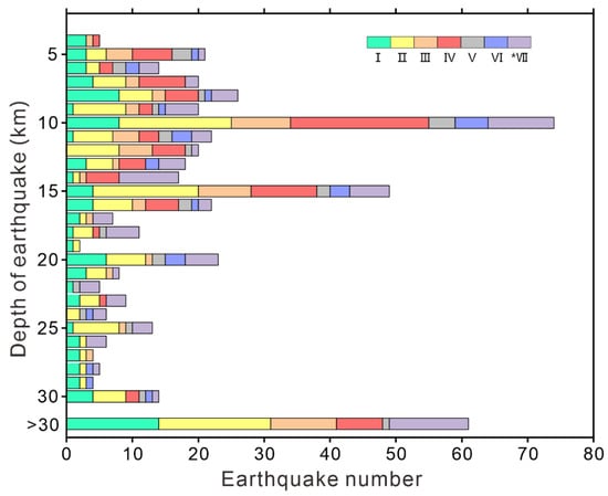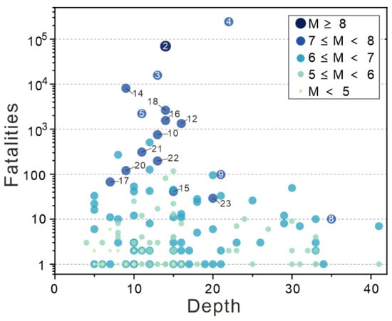 The depth of the earthquake is the vertical distance from the epicenter to the ground, which is closely related to the tectonic zoning. Under the same conditions, the shallower the depth of the earthquake, the greater its destructive capacity. In this study, only 503 of the 608 earthquake events were recorded with accurate depths. The Chinese mainland is divided into six subregions according to the main tectonic block boundaries [37]. The spatial distribution of earthquake depths is shown in Figure 9. The earthquake depths in the Westfield fault block region are distributed in the range of 4–64 km, with an average depth of 19 km. The earthquake depths in the Tibetan fault block region are distributed in the range of 5–48 km, with an average depth of 17.4 km. Similarly, the earthquake depths of the Dian–Mian fault block region, South China fault block region, North China fault block region, Northeast Asia fault block region are 4–34, 4–48, 5–33, 5–30 km, with an average depth of 15.6, 13.2, 14.7, and 14.4 km, respectively. The earthquake depths between the blocks are distributed in the range of 5–50 km, with an average depth of 18 km. The M6.0 earthquake in Gashi, Xinjiang that occurred on 2 August 1998 is the deepest earthquake (64 km) on record, causing three injuries and an economic loss of 7.65 million USD. Among the 503 earthquake events, there are 321 (63.8%) events with an earthquake depth within 5–16 km. The detailed statistics of earthquake depths are shown in Figure 10. Finally, we analyzed the effect of the earthquake depth on the number of fatalities. As shown in Figure 11, all earthquakes causing more than 100 deaths have a focal depth of less than 25 km, mostly concentrated in the range of 10–20 km. When the focal depth exceeds 30 km, the number of fatalities is no larger than 10. Only two of the earthquake events with focal depths greater than 40 km resulted in fatalities: the Urumqi M6.6 earthquake in 1965 and the Atushi M5.7 earthquake in 1971. Notably, the 1976 M7.8 Tangshan earthquake was smaller in magnitude than the 2008 M8.0 Wenchuan earthquake, but it caused the largest number of fatalities. The epicenter of Tangshan earthquake is located in the downtown area of Tangshan City, with high population density, resulting in destructive housing damage and serious casualties. By contrast, the epicenter of the Wenchuan earthquake is located in a mountainous area, with a much smaller population density, and the regional secondary hazards are mainly landslides. Beichuan county, which has the highest concentration of casualties associated with the Wenchuan earthquake, is more than 100 km from the epicenter.