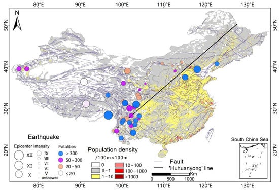 Spatial distribution of epicentral intensity. “Hu Huanyong line” [36]—a population division line separating China into two parts, East and West.