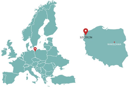 The territorial scope of the research was limited to Szczecin within the city’s administrative borders. Szczecin (ger. Stettin, lat. Sedinum or Stetinum) is located in north-western Poland, in the western part of the West Pomeranian Voivodeship, at the Polish-German border (Figure 1). The city is located on the Oder River and near the Dąbie Lake. The sea is about 100 km away. The specific location and the port and shipyard developed on its basis make it a city associated with the sea. According to data from the Central Statistical Office, Szczecin had a population of 393,472 in 2022 [45]. It is the third largest city in Poland in terms of geographic area occupied.