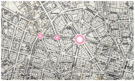 Another breakthrough event in the development of Szczecin occurred in 1873 when the Szczecin fortress was demolished. This enabled rapid residential development of the city. At the turn of the 19th and 20th centuries, Szczecin obtained a new urban layout, and its area began to increase along with the incorporation of already urbanized and independent suburban housing estates and towns into its borders. The new urban layout was based on characteristic round squares and streets radiating outwards in a star-shaped layout (1882, designed by Konrad Kruhl, inspired by Mayor Herman Haken) (Figure 2). The construction of the downtown complex, quarters of eclectic tenement houses modeled on the urban layout of nearby Berlin, was begun during this period. In the years 1902–1921, a complex then known as Haken’s Terraces (now Chrobry Embankment, Polish: Wały Chrobrego) was built in the form of a representative boulevard with monumental buildings (today these are: Maritime University, the building of the National Museum together with the Contemporary Theater and the Provincial Office), pavilions and a large basin with a fountain at the foot, creating an excellent showcase of the city on the Oder. The complex is 500 m long and 19 m above the river’s bank.