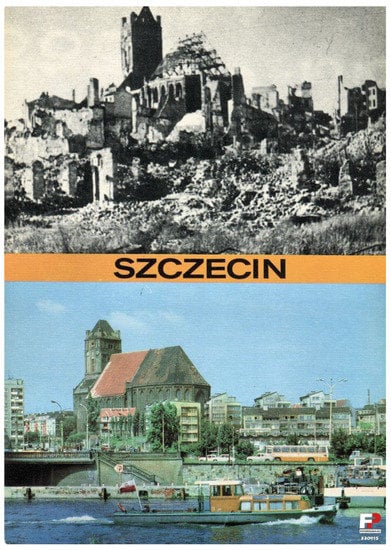 War damages of Szczecin—Arch Cathedral Basilica of St. James in 1945 and 1985. A postcard. Authors: Archiwum Miejskiej Pracowni Urbanistycznej w Szczecinie and J. Makarewicz. Publisher: KAW. Source: Fotopolska.eu.