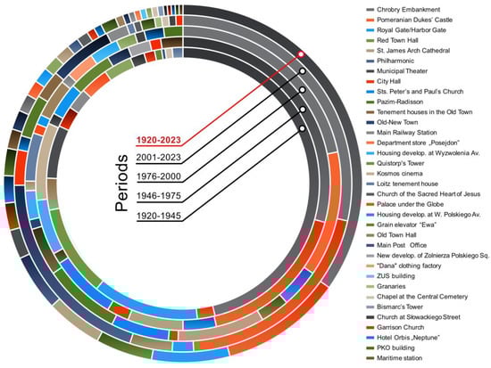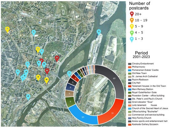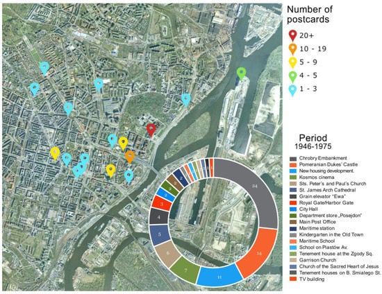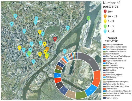 Over three thousand different postcards, between 1920 and 2023, were analyzed to obtain a ranking of the popularity of the architectural objects depicted in them. Popularity was determined in terms of the commutative number of appearances of objects in the postcards. Cards were then categorized into the following four historical epochs according to the year of publication of the card: 1920–1945 (pre-war Szczecin); 1946–1975 (post-war socialist Szczecin); 1976–2000 (transforming Szczecin); and 2001–2023 (modern Szczecin) (Figure 4).