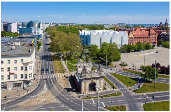 Third place was taken by another historical object constituted by fragments of Szczecin’s fortifications in the forms of the Port Gate (German name: Berliner Tor) and the Royal Gate (German name: Anklamer Tor) (Figure 7). Both historic gates were carved in a Baroque style according to the design of Gerhard Cornelius van Wallrawe, were richly decorated with sculptural decorations, and were built during the Prussian extension of the Szczecin fortress in 1724–1740 and 1725–1728, respectively. The gates play an important role in the spatial organization of Szczecin’s downtown precinct due to their location in the middle of a transport hub: the Port Gate at the junction of the Old Town district and the 19th-century city center, and the Royal Gate at the junction of the Old Town and the newer northern districts of Szczecin.