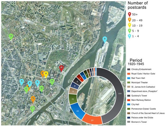 The analysis covered several digital databases containing archival and contemporary postcards, such as Fotopolska [40] (a documentary and historical portal in which 325 archived and contemporary postcards of Szczecin were found); Szczecin Postcard Museum [41] (a virtual museum showing postcards issued after 1945 with a resource of 226 postcards); The Digital Libraries Federation [42] (a website providing on-line access to the collections of Polish science and culture institutions, in the resources of which 537 archival postcards from pre-war Szczecin were found); Pomerania Digital Libraries Collections [43] (a website providing access to the resources of regional and national cultural heritage, which contains 2227 archival postcards of Szczecin); and Visit Szczecin [44] (a portal for tourists in which 201 contemporary postcards of Szczecin were found, showing images of the city from the last few years).