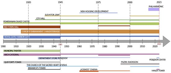 A total of 3315 postcards of Szczecin were reviewed, of which 445 were selected for further analysis as these met the temporal and substantive criteria; that is, these were postcards dated between 1920 and 2023 that depicted a specific architectural object or objects located in Szczecin. Postcards depicting sculptures, monuments, greenery and city parks, and engineering structures, as well as postcards that are too general to indicate a specific architectural object, that is, the leitmotif, were excluded. The objects shown on the postcards were assigned to one of four historical epochs, each covering a period of approximately 25 years: 1920–1945 (pre-war Szczecin); 1946–1975 (post-war socialist Szczecin); 1976–2000 (Szczecin during political transformation); and 2001–2023 (contemporary Szczecin).