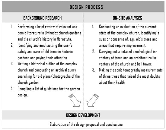 We organized the design process in three stages. Firstly, we reviewed the scientific literature and papers. We presented the church’s history in Horostyta, described the main guidelines for designing the church gardens, and explained the symbolism used in these gardens. The next stage of the research consisted of visiting the chosen site for measurements and data gathering and evaluating the site’s current garden. The last stage of the research consisted of data processing and the final design proposal based on the findings and insights. We used CorelDraw, Sketchup, and Photoshop software to represent the graphical elements. The stages of the design process are presented below (Figure 1).