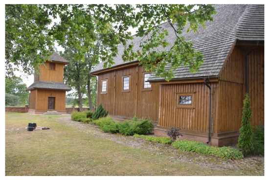The church in Horostyta is oriented with the apse and altar facing east, and the entrance is in the opposite western wall. It is built of wood with a log structure on foundations, planked outside and inside, and reinforced with foxholes (Figure 5 and Figure 6). On a rectangular plan, the nave has a newer babiniec added to the west and a slightly narrower, short chancel to the east. Adjoining the chancel to the north and south are rectangular, lower annexes housing the sacristy and treasury. The interior, once tripartite, is now a hall, with a newer music choir in the western part. The windows are rectangular, with semicircular closed windows in the chancel and transverse windows in the sacristy and treasury. The nave is accessed from the north by a stave door with a diamond studded pattern. The roof over the body was once tripartite, with a cupola over the central part. Today, it is five-pitched, shared by the nave and chancel, ending at the bottom with wide eaves with a lambrequin. The side slopes of the roof extend over the sacristy and vault. However, an onion-shaped signature tower rises in the middle of the ridge. Above the granary, the roof has a gabled form. All roofs are covered with shingles [45,46].