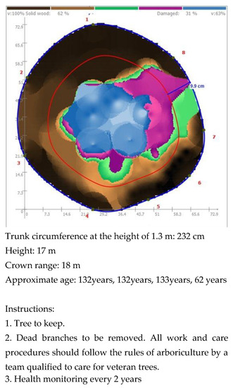 Acoustic tomography is based on measuring sound waves passing through the tree trunk between installed sensors. The sound waves are excited by tapping the individual sensors with an electronic hammer. The measurement process results in a color tomogram illustrating the sound velocity distribution over a trunk cross-section. The default color code for interpreting the results obtained using the included software is as follows: brown and black areas indicate high sound wave velocities corresponding to healthy wood; green corresponds to medium velocities, indicating a transition area between solid and nonsolid wood, but in some cases, it can also suggest problems inside the trunk; and purple, blue, and white areas indicate low sound velocities, characteristic of damage or voids inside the trunk. The processed sound velocity map (tomogram) can be used as a basis for making a scientific and knowledge-based decision on the viability of a tree without felling it. Yellow lines on the cross-section of the trunk suggest the occurrence of internal cracks, which often do not give apparent external symptoms. The thicker the line, the greater the risk of such an occurrence. In contrast, a red line on the tomogram indicates the limiting wall thickness, which allows the determination of the minimum mechanical strength of the tree trunk [41].