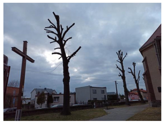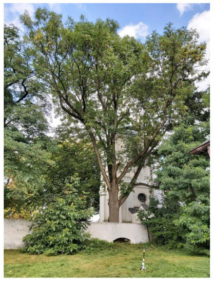 The assessed tree grew on a slight elevation at a distance of 1.5 m from the fence separating the church from the cemetery. The distance from the walls of the church building was 14 m, and it was 1 m from the neighboring tree (Figure 11). In the tree’s crown, the growth of small downy branches was estimated at 20%, with hanging branches and wilting leaves. Traces of the maintenance work carried out were visible, and the areas of cuts were well healed. Based on the tomographic results obtained, small foci characterized by weakened internal wood structures were estimated at 8%, located on the northern side of the trunk section. They did not significantly affect the mechanical strength of the trunk. Technically sound wood occupied 85% of the trunk cross-section, and the remaining part (7%) was so-called transitional wood with a slightly weakened structure but was not yet damaged. The recorded speed of sound inside the trunk ranged from 817 to 1150 m s−1, which suggested the tree was in good condition, especially since, according to the available literature, the average speed of sound waves in healthy linden wood is in the range between 940 and 1183 m s−1 [58].
