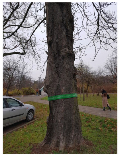 We examined trees from all sides, from roots to crown. Visual assessment is always qualitative and sometimes subject to errors depending on the assessor’s experience, which should be considered when interpreting the results [18,19,20]. Of the 15 trees examined, we classified 10 as healthy with no visible damage. The remaining 5 specimens showed noticeable weakness (excessive branch drift, diminished leaves, and falling bark). Three specimens were subjected to detailed acoustic tomography examination for final confirmation of their health status.