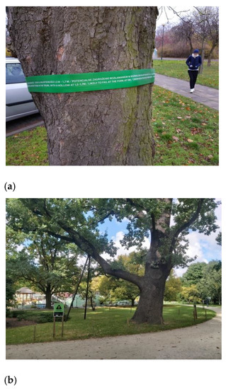 - Mydłowska, A. Protection of greenery in the investment process, taking into account dendrological knowledge. In Attachment to the Training Materials Fri Visual Diagnosis of Trees Threating Safety-Methods and Ways to Improve the Control of the Urban Tree Stand; Dendros Poznań: Poznań, Poland, 2014. [Google Scholar]
