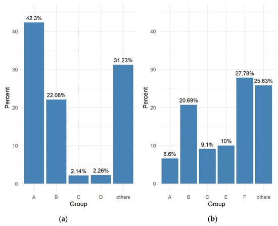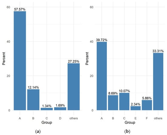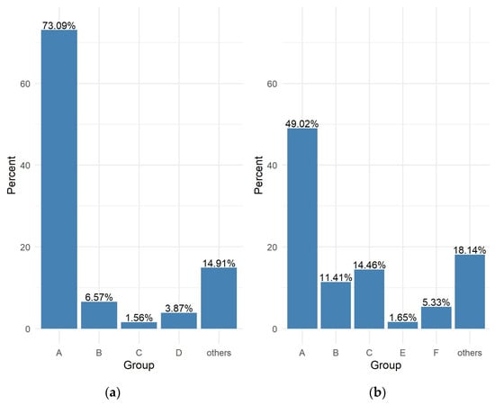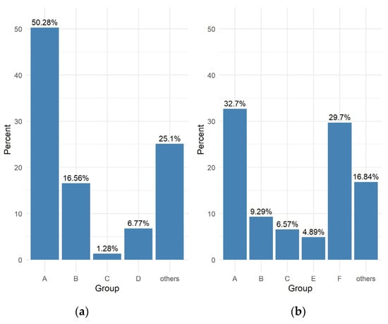 The same statistical analyzes were performed for open questions 3 to 9, the only difference being how the responses were grouped. At the beginning, blank responses were excluded, and the remaining responses were prepared by removing Polish characters and changing all capital letters to lowercase. Next, a division into groups: “A”, “B”, “C” and „D” was carried out according to keywords. A response that contained a word from the list corresponding to a given group was assigned to that group. In the case of conflicts and belonging to several groups at the same time, the most extreme group was selected; that is, for groups ABC, C would be selected, and for BD, D would be selected. Responses that were not classified into any group were placed in the “other” category.