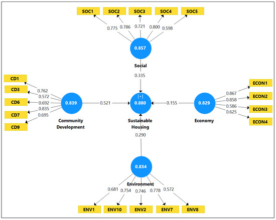 As shown in Table 8, the composite reliability for community development, economy, environment, and social factors are 0.839, 0.829, 0.834, and 0.857, respectively. Furthermore, Cronbach’s alpha values of community development, economy, environment, and social factors are 0.758, 0.722, 0.761, and 0.790, respectively. The values have met the threshold value specifically between 0.70 and 0.90 and are considered reliable [54].