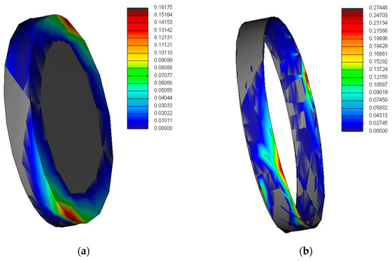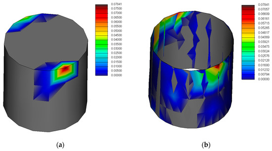 After passing the conveyor belt through the drum, the belt was straightened, which caused contact pressure on the cylindrical magnet inserted into the belt. The created stress–strain state was analyzed using FEM (finite element method) analysis in the Creo-Simulate 7.0 software, the results of which can be seen in the following figures.