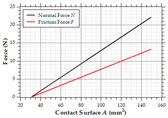 Table 3, the linear regression coefficients are overviewed. It can be seen that the simulation results confirmed the theoretical assumptions that with increasing contact surface, the normal and friction force would also increase. The deviation from the linear dependence was evaluated in the form of the RMSE (root mean square error) and RSS (residual sum of squares).