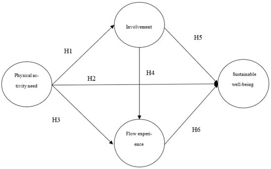 Sustainable well-being is an emotional experience that continues to be positive and peaceful in the face of difficulties and challenges []. Researchers have indicated that higher physical activity flow experiences are strongly associated with sustainable well-being []. For example, if people have a more exciting or pleasurable experience when engaging in physical activity, this also facilitates a more positive emotional experience []. In addition, related studies have found that although the epidemic limited outdoor physical activity among university students, those who participated in indoor physical activities such as yoga and calisthenics could obtain a certain level of excitement and pleasure through physical activity, which also contributed to their sustainable well-being []. More importantly, due to the emergence of more risks as well as uncertainties in the post-pandemic era, these complex learning environments and needs can have a significant impact on university students’ well-being, and the flow experience of physical activity will be beneficial in helping them recover from anxiety and other tensions as soon as possible, continuously influencing their sustainable well-being []. That is, in the current post-pandemic context, university students with higher flow experience in physical activity will have higher levels of sustainable well-being. Thus, the relationship between university students’ flow experience and sustainable well-being was hypothesized as follows: