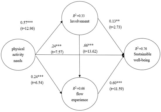 To understand whether there is a direct impact of physical activity demand on sustainable well-being among university students during the post-pandemic period, this study used path analysis to explore the relationship between variables. Therefore, the model validation results indicated that physical activity needs had a positive effect on the level of involvement (β = 0.57 ***; t = 12.96); physical activity needs positively affected sustainable well-being (β = 0.24 ***; t = 7.57); physical activity needs positively affected flow experience (β = 0.24 ***; t = 6.54); level of involvement positively affected flow experience (β = 0.66 ***; t = 13.62); level of involvement positively affected sustainable well-being (β = 0.13 **; t = 2.73); and flow experience had a positive effect on sustainable well-being (β = 0.60 ***; t = 11.59), as can be seen in Figure 2.