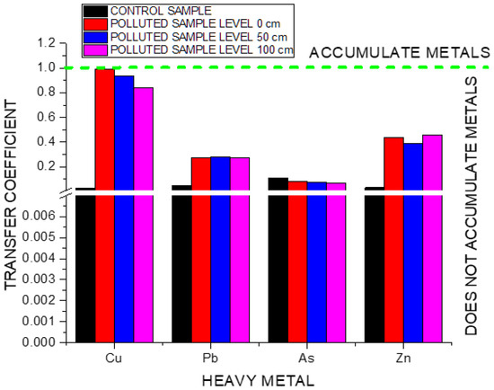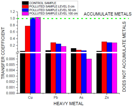 The ratio of the concentration of metals in the root to their content in the soil (mg/kg) is defined as the transfer coefficient (TC) (or bioaccumulation factor, Equation (1)). It indicates the plant’s ability to accumulate metals from the soil [8,9].