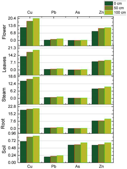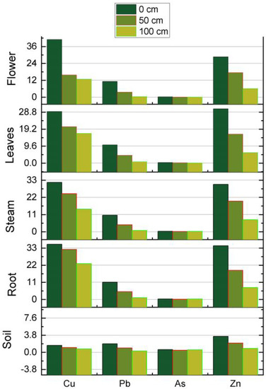 It is well known that high concentrations of heavy metals affect both soil and plants. According to the Government Decree no. 161 of 16 February 2006, entitled Elements and standards for the chemical quality of alluvia—Section 63 μm, metals with high permissible limits are considered safe. In soils, the acceptable levels for Zn are highest, followed by Pb and Cu, while the acceptable levels for As are lowest. This threshold means that the accumulation of As in soils, even at lower levels, is more toxic than those of Cu, Pb, and Zn. In plants, the As limit is highest, followed by Pb, Zn, and Cd. Contrary to soils, As has the safest thresholds, followed by Zn and Pb, while Cu accumulation in plants is the worst [2,5].