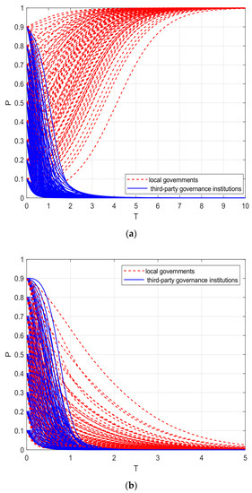 From Table 4, the following conclusions can be drawn: the equilibrium results of the game between local governments and third-party governance institutions are (1, 0) and (0, 0). When means that if local governments regulate, the default compensation that can be obtained in the case of negative governance by third-party governance institutions is higher than the cost of regulation, so local governments will tend to adopt the “regulation” strategy. When , it means that if third-party governance institutions choose the “negative governance” strategy and are regulated by local governments, their default cost and negative governance costs will still be smaller than the active governance costs. At this time, third-party governance institutions are more likely to prefer the “negative governance” strategy, and the stable equilibrium point between the two parties is {active regulation, negative governance}. This shows that, at this time, although the benefits of local governments regulating third-party governance institutions are higher than the benefits of not regulating them, third-party governance institutions prefer default damages and eventually tend to choose the “negative governance” strategy due to the low cost of breach of contract. When , it means that if local governments regulate, they tend to adopt the “non-regulation” strategy if the liquidated damages they can obtain in the event of negative governance by third-party governance institutions are lower than the costs of regulation. Since the responsibilities of both parties cannot be defined when local governments do not regulate, third-party governance institutions are not responsible for the liquidated damages liability, so third-party governance institutions will tend to adopt the “negative governance” strategy as they will not receive liquidated damages, no matter how high the costs of default are set. This indicates that, at this time, the third-party governance contracts set up in the market are still relatively immature, local governments’ regulatory costs are still high, and no additional benefits can be obtained from regulation.