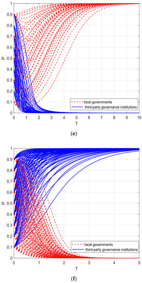 Let , , , , and or let , , , , and . At this time, the costs of negative governance and re-governance by third-party governance institutions are higher than the costs of active governance, so, regardless of whether the compensation benefits received by local governments when regulating third-party governance institutions for negative governance are higher than the costs of regulation , third-party governance institutions will be inclined to choose the “active governance” strategy. At this time, no regulation is the optimal evolutionary strategy of third-party governance institutions. The system evolutionary simulation results are shown in Figure 1f.