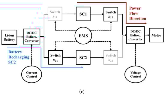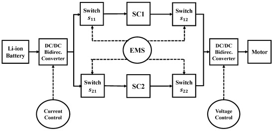 In the aforementioned battery–SC connection topologies and EMS strategies, both the EV battery and the SCs are used to supply energy to the EV motor in different driving cycles, and the EMS is responsible for regulating the power provisioning between the two sources. Nonetheless, as the power and energy requirements of EVs increase to address range anxiety concerns, larger energy storage units are required, corresponding to added weight and cost of EVs. However, according to Ref. [43], with the higher power densities of SCs compared to Li-ion batteries, each additional kW required can be supplied by a supercapacitor bank that is 10–20 times lighter than a Li-ion battery counterpart. This means that, with optimal sizing of the SC bank, SCs can be utilized as primary sources of power to the EV motor during urban driving patterns with frequent accelerations and decelerations in which higher power bursts are required, without a significant addition to the total EV weight and energy consumption.