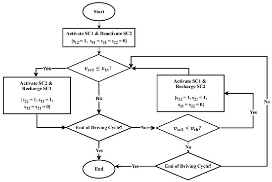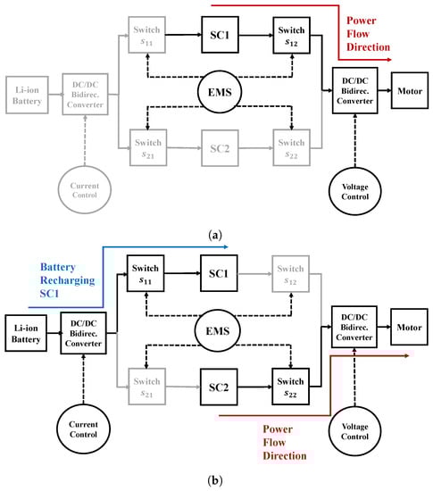 At the beginning of the driving cycle, assuming the battery and the two SC banks are both fully charged, SC1 supplies power to the EV motor by turning on switch and keeping all other switches off, as shown in Figure 4a. During its power supply duration, the terminal voltage across the SC decreases as it supplies energy to the EV motor. As SC1 depletes its stored energy, its terminal voltage, , significantly drops. A minimum voltage threshold, , is selected to indicate the depletion of the SC bank. This is chosen to be of the rated SC voltage to prevent its excessive depletion beyond that point. As falls below , the EMS turns off switch by sending a ’0’ signal to its gate, and turns to the ON state using a ‘+1’ gate signal. This enables recharging SC1 from the Li-ion battery. On the other hand, is turned to the ON state to allow the second SC bank, SC2, to supply the motor requirements, as shown in Figure 4b. As the voltage across SC2 falls below , SC1 is reactivated by switching on , while SC2 is allowed to recharge by switching to the ON state and switching to the OFF state, as shown in Figure 4c. The terminal voltages of both SC banks are continuously monitored by the EMS to regulate their charging/discharging processes through the gate controlled switches.