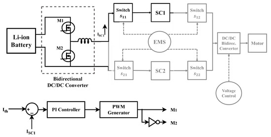 As shown in Figure 2, a bidirectional DC/DC converter is connected between the Li-ion battery and the two SC banks. Pulse width modulation (PWM) is utilized to control the active switches of this converter to avoid over-discharging of the battery during the SC recharge process. This is illustrated in Figure 5. In this work, over-discharging of a Li-ion battery is assumed to take place when its discharge current exceeds twice its rated capacity, i.e., if . A current sensor detects the current drawn by the depleted SC, or , as it is connected to the battery through its respective switch, or , and compares this current value to the current threshold value, , of . A PI controller is utilized to regulate the difference between the current limit and the actual battery current, . This difference is then fed into the PWM modulator to provide the required switching signals to the MOSFET switches. This accordingly protects the battery from excessive discharge that would impact its aging performance.