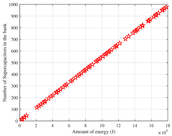 By executing the GA on the SC sizing model, a Pareto front of the different combinations of parallel and series connected SC cells is obtained, as shown in Figure 6. A point on the Pareto front that corresponds to and is selected because an even number of parallel SCs is required to simplify the implementation of the SC pack. The specifications of the resulting capacitor bank are summarized in Table 3.