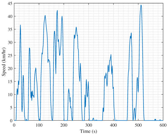 An urban driving cycle is employed to simulate the proposed H-HESS that mainly relies on the SC pack to address the motor requirements. The 600 s NYCC in Ref. [55] is considered with a maximum speed of around 33 km/h. This is shown in Figure 7.
