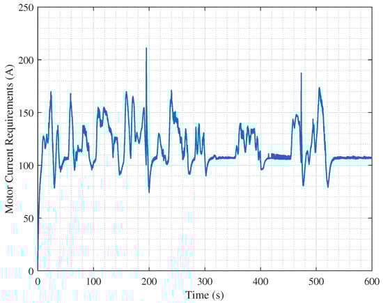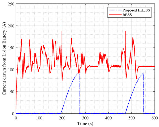The current drawn from the EV battery in the proposed H-HESS to recharge the depleted SCs is plotted in Figure 10. This is in comparison to the current drawn from an identical battery in a traditional BESS, in which the battery is solely responsible for supplying the motor’s requirements.