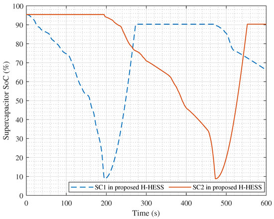 SoC pattern of the two supercapacitor banks in the proposed H-HESS.
