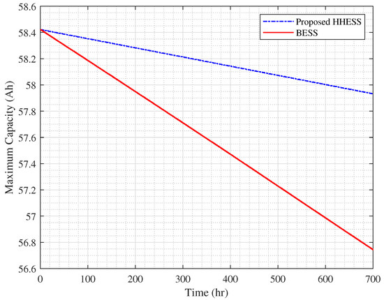 Loss in capacity of the Li-ion battery in the proposed H-HESS versus that in a BESS over a period of 30 days.